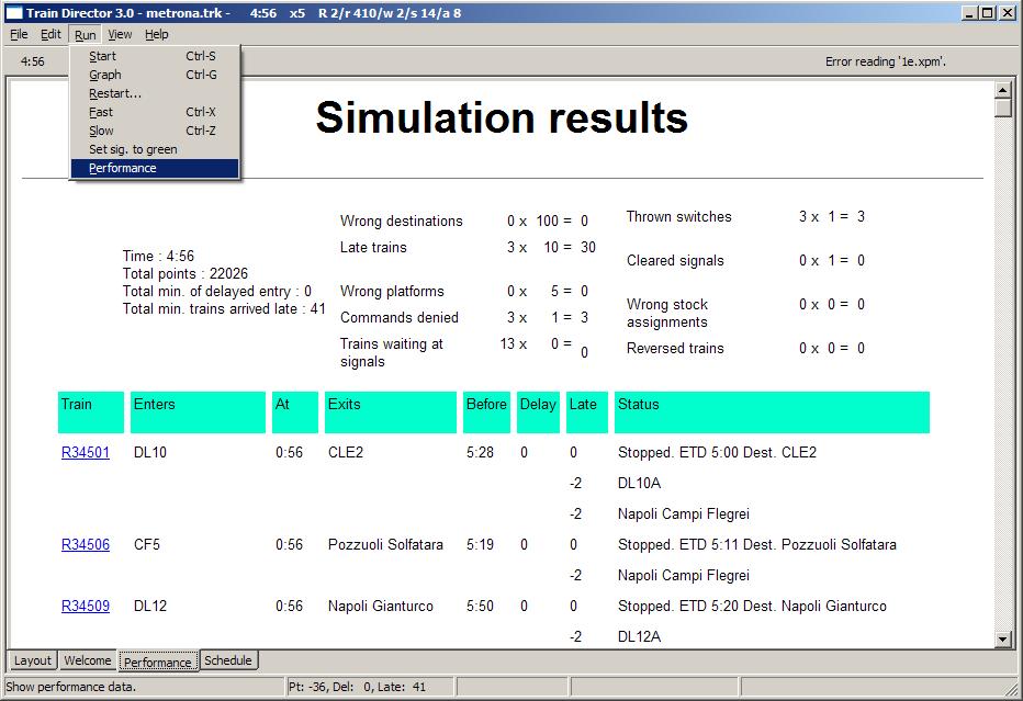 Procedendo nella simulazione di un tracciato è possibile che si acquisiscano penalità, per esempio perchè un treno ha accumulato del ritardo. Si può visualizzare le penalità accumulate fino a quel punto della simulazione con il menù "Run"+"Performance". Selezionando questa funzione viene presentata una pagina riassuntiva con le penalità e lo stato corrente dei treni: